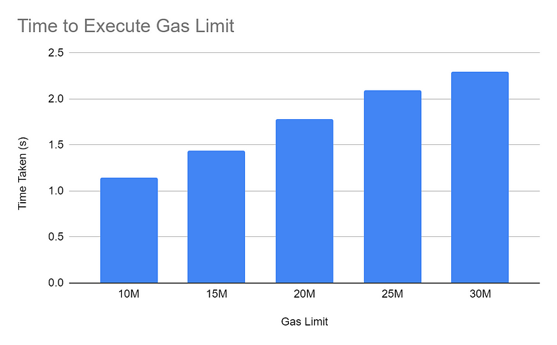 Running on modern hardware, we can comfortably process 15M gas in less than 2 seconds. Execution time also scales linearly as the gas limit increases. With additional optimisation it is possible to lower execution time even further at higher gas limits.