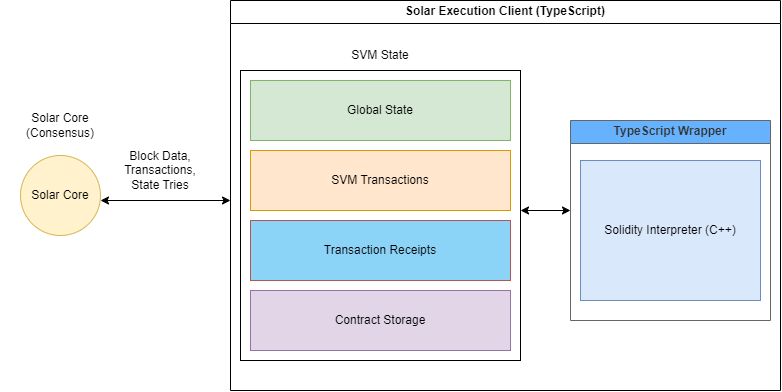 SVM functions as our Execution client/module. It is specifically designed to handle the execution of smart contracts as well as maintaining and updating their state. Together, they work in synergy to allow for fast and secure smart contract execution on the Solar blockchain.