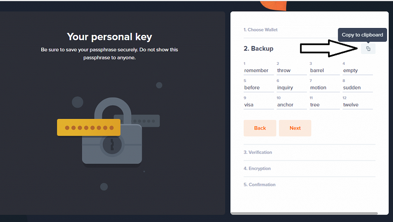 4. Once you choose a wallet you will be presented with 12 words all lowercase. This is your passphrase.